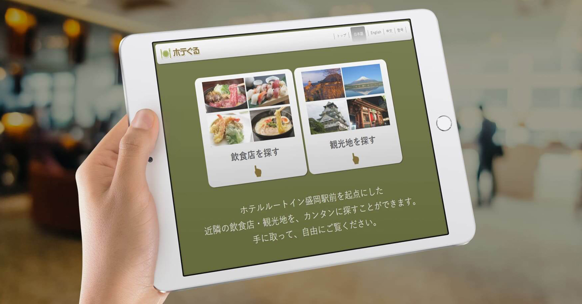 「ホテぐる」は、宿泊施設内に設置された専用端末やタブレット、紙媒体などを通じて、周辺飲食店情報を分かりやすく提供するサービスです。ホテルおすすめの飲食店・観光情報を紹介し、日本語を含む4言語に対応しています。